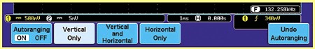 The Auto Range function automatically adjusts the time base and/or the vertical scale of displayed waveform when the frequency and/or the amplitude of input signal changed. This function gives user the convenience to have DSO always display waveform in a proper fashion on the screen tracking the frequency and amplitude changes of the input signal. It is especially useful when the user needs to alternately probe and test multiple circuit points containing signals with different frequencies and amplitudes.