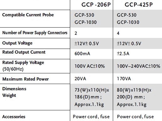 GCP-206P / GCP-425P Current Probe Power Supplies Specifications
