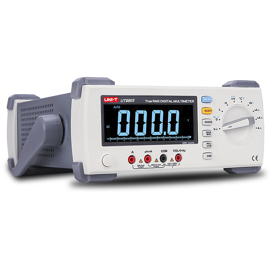 Uni-T's UT8803E is a high-performance, AC-powered digital multimeter. It's a portable desktop device with a large, backlit screen that makes it easy to read. The device is designed with full function testing, full range overload protection, and a unique appearance. It can measure a variety of parameters including AC/DC voltage, AC/DC current, resistance, frequency, capacitance, inductance, triode HFE, diode (LED), thyristor (SCR), and circuit on-off, making it a multifunctional, high-precision, and automated solution for users' measurement needs.